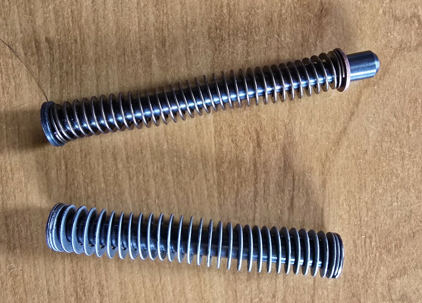 Celem zwiększenia wagi końcówki żerdzi dłuższe od standardowej mają poszerzenie stożkowe z ciężarkiem na końcówce. Żerdź o długości 78mm nie ma stożka ani ciężarka, jest od razu zakończona pierścieniem lokującym sprężynę. Sprężyna wypełnia całą długość żerdzi. Poniżej widać 90mm i oryginalną, żerdzie pasujące do Walther PPQ.